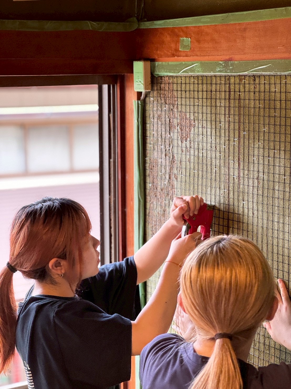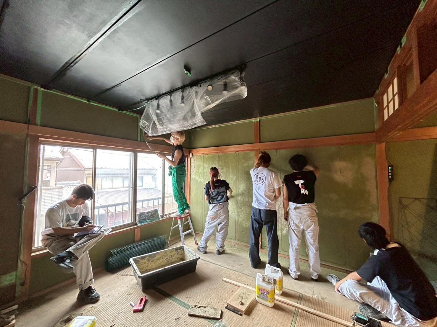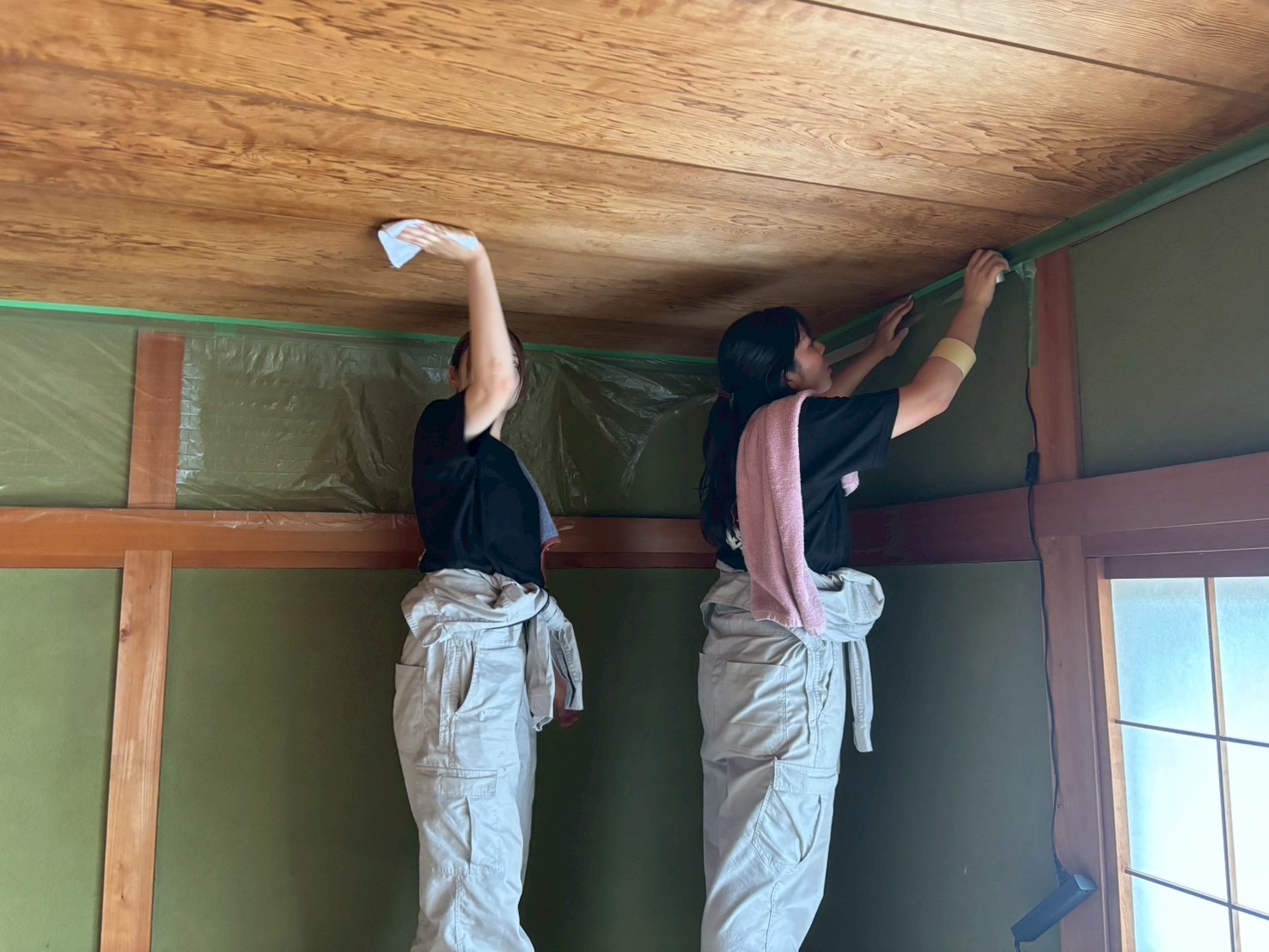 新しく仕上げた壁や床を汚さないよう、まずは天井から作業を始めた。